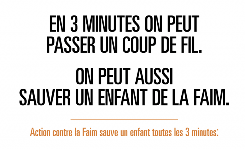 Mais il existe aussi un autre bilan : toutes les 3 minutes, Action contre la Faim soigne un enfant souffrant de la faim.